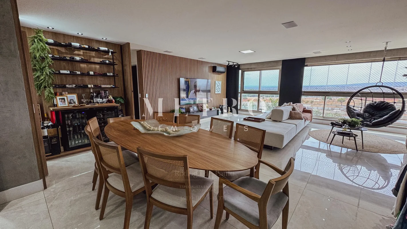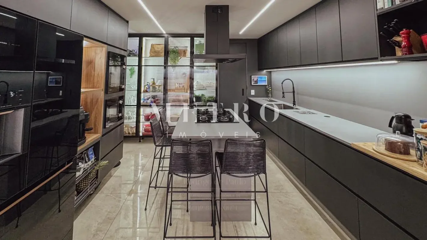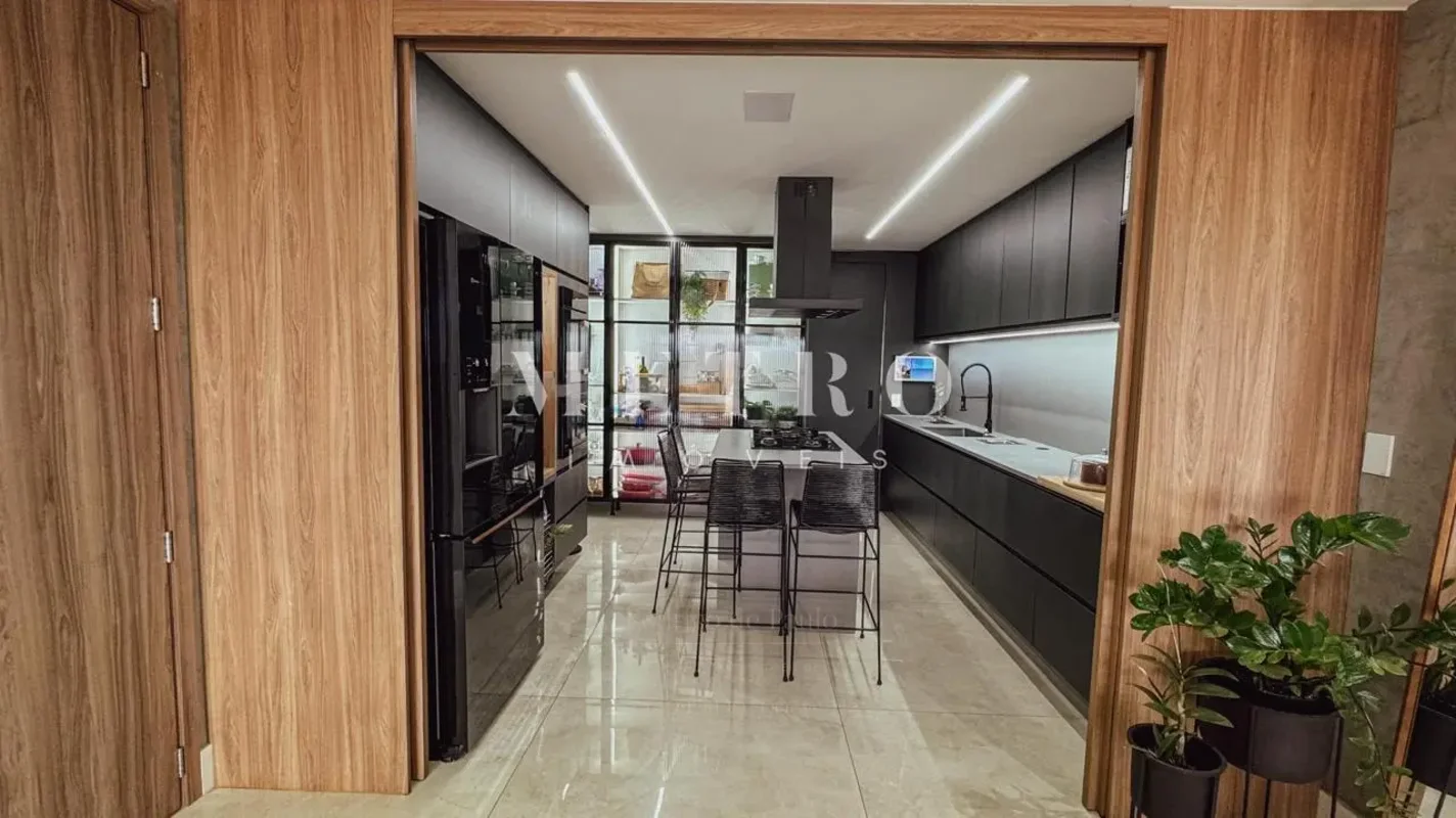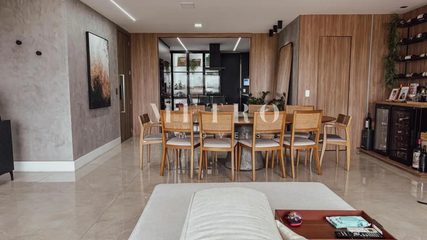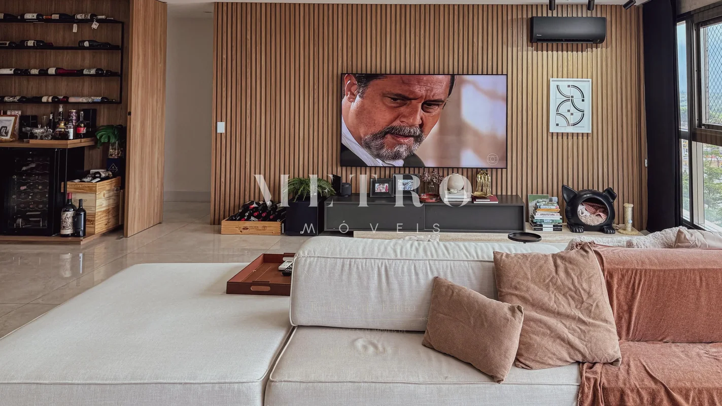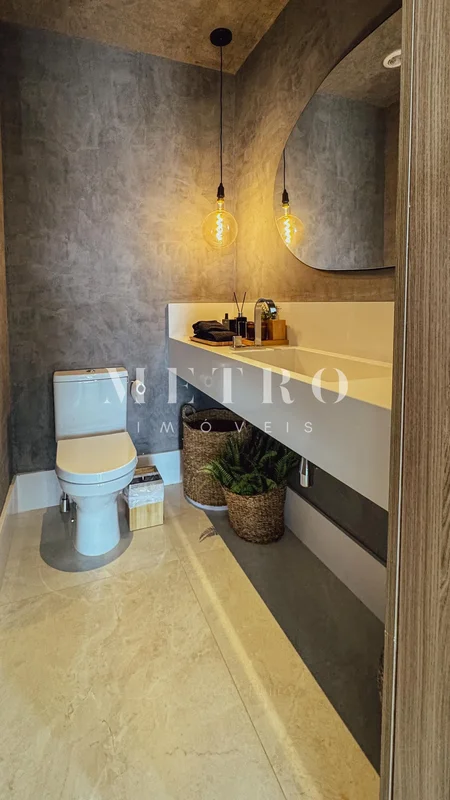 • Sala ampla integrada à cozinha americana, com projeto moderno, iluminação natural abundante e lavabo elegante;