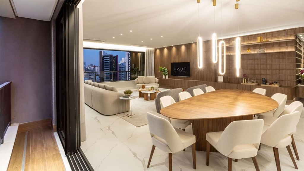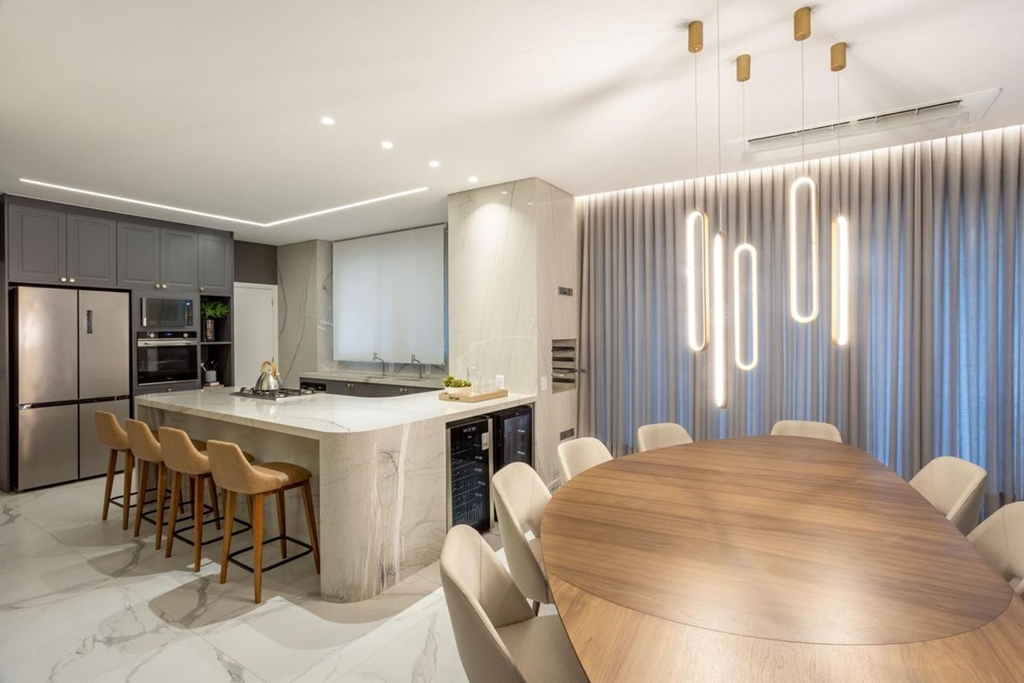 Entre as comodidades, o apartamento conta com uma adega, ar-condicionado, churrasqueira, cozinha americana e gourmet, além de um espaço reservado para um escritório, proporcionando um ambiente ideal para trabalho ou estudo. A fechadura digital e o elevador privativo ainda garantem praticidade e segurança no dia a dia.